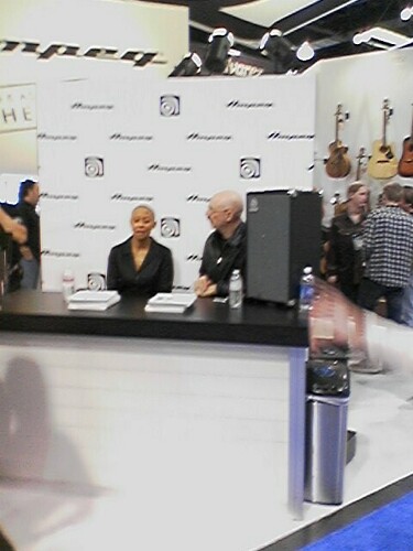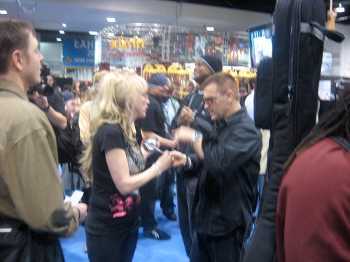Taylor–we joined half the people attending NAMM in here. Cool guitars, but nothing I hadn’t seen before. Except that on stage there was a cool-looking Bad Cat Lynx set up for one of the artists to play later. (Bad Cat’s light up!) And, just like in Guitar Center, there were a slew of people sitting down, playing Taylor guitars, hoping to get ‘discovered.’ How do I know they weren’t just trying out the tone of the guitar? Because they were singing, too. Usually a Tom Petty song. Although it’s difficult to tell, because there’s so many of them all around each other playing different Tom Petty songs. And how do I know they weren’t just having fun? Because of the desperate and eager looks on their faces as I walked by them, hoping I was a celebrity or Taylor rep who would sponsor them and make them famous. And even if I was, it’s like, ‘You’re playing an E chord. Badly. What do you want me to do?’ And if that sounds harsh, don’t worry. I get my chance to play some stuff, and I’m sure people walked by thinking, ‘Dotted 8th delay again? Doesn’t he know that’s already been invented?’ It had to have happened.