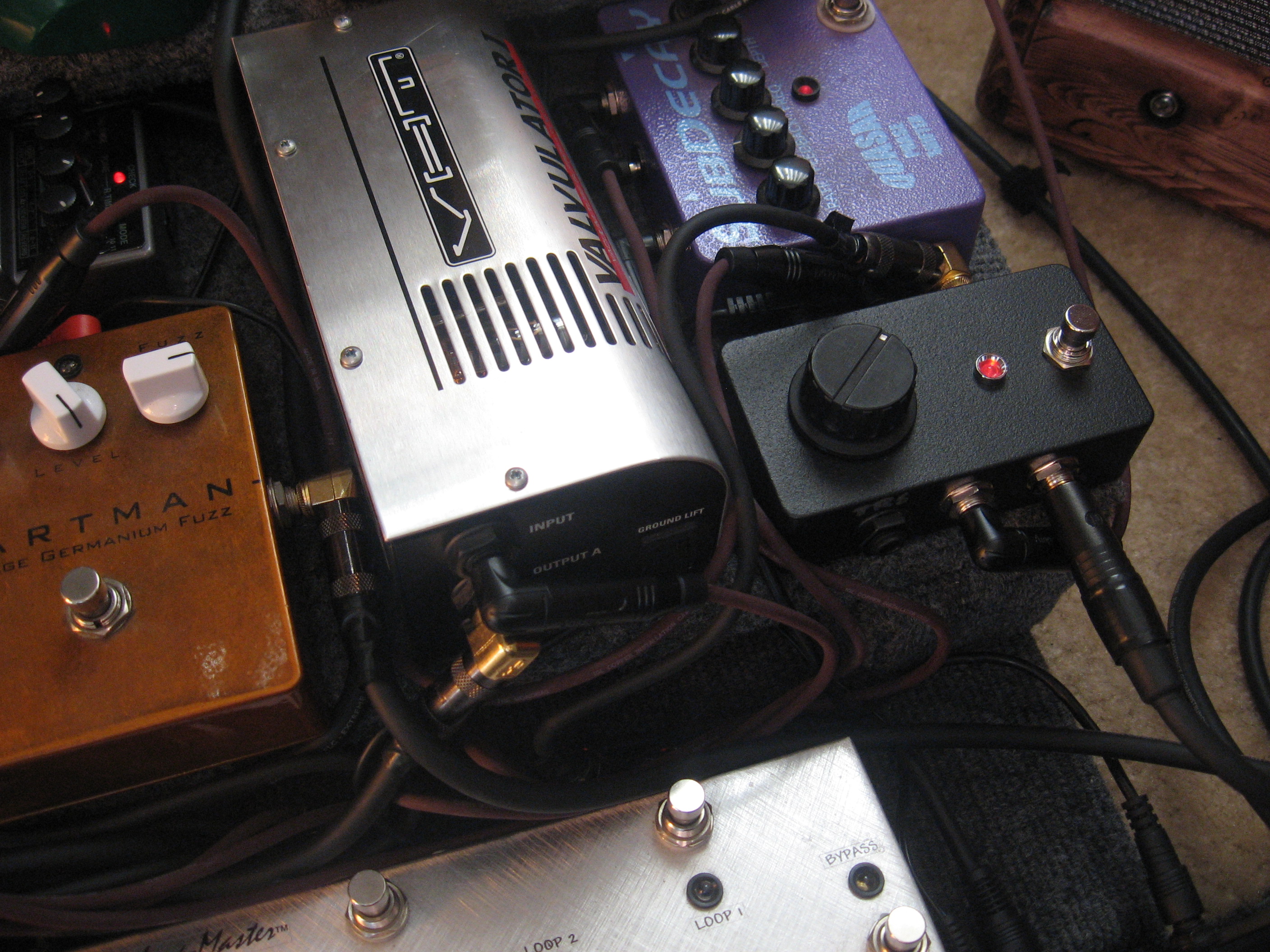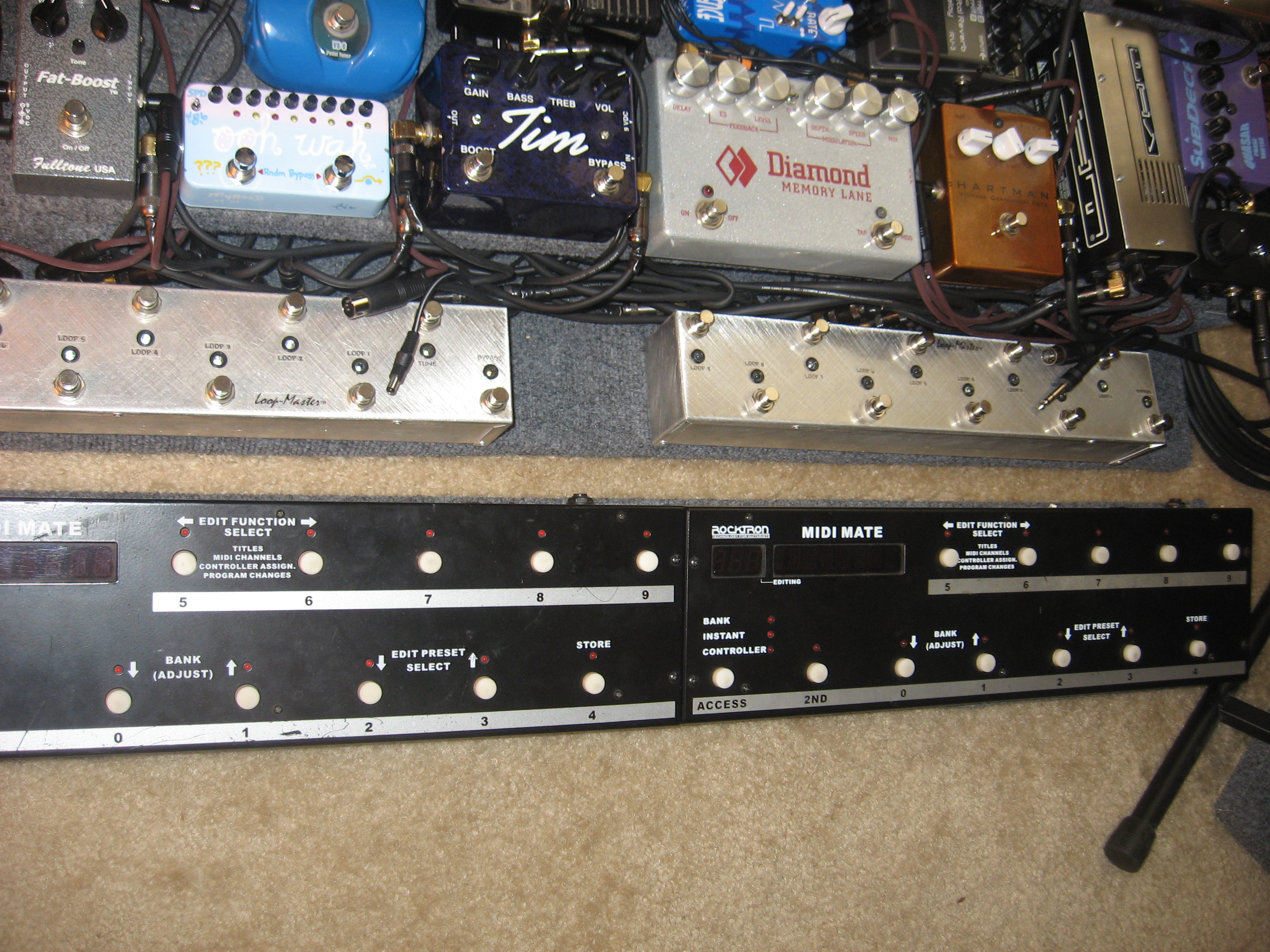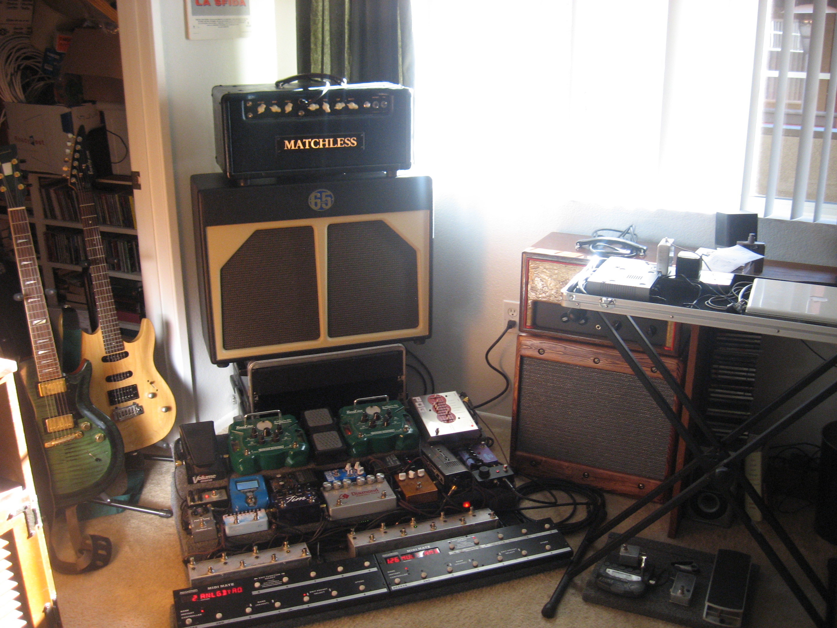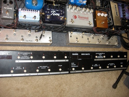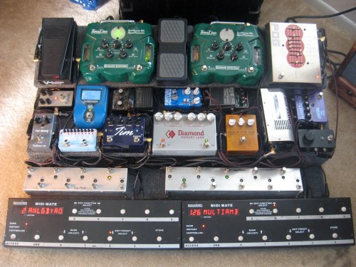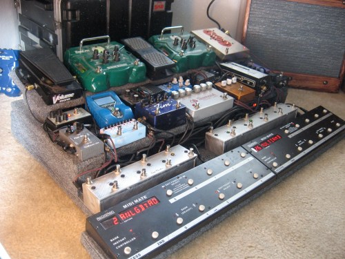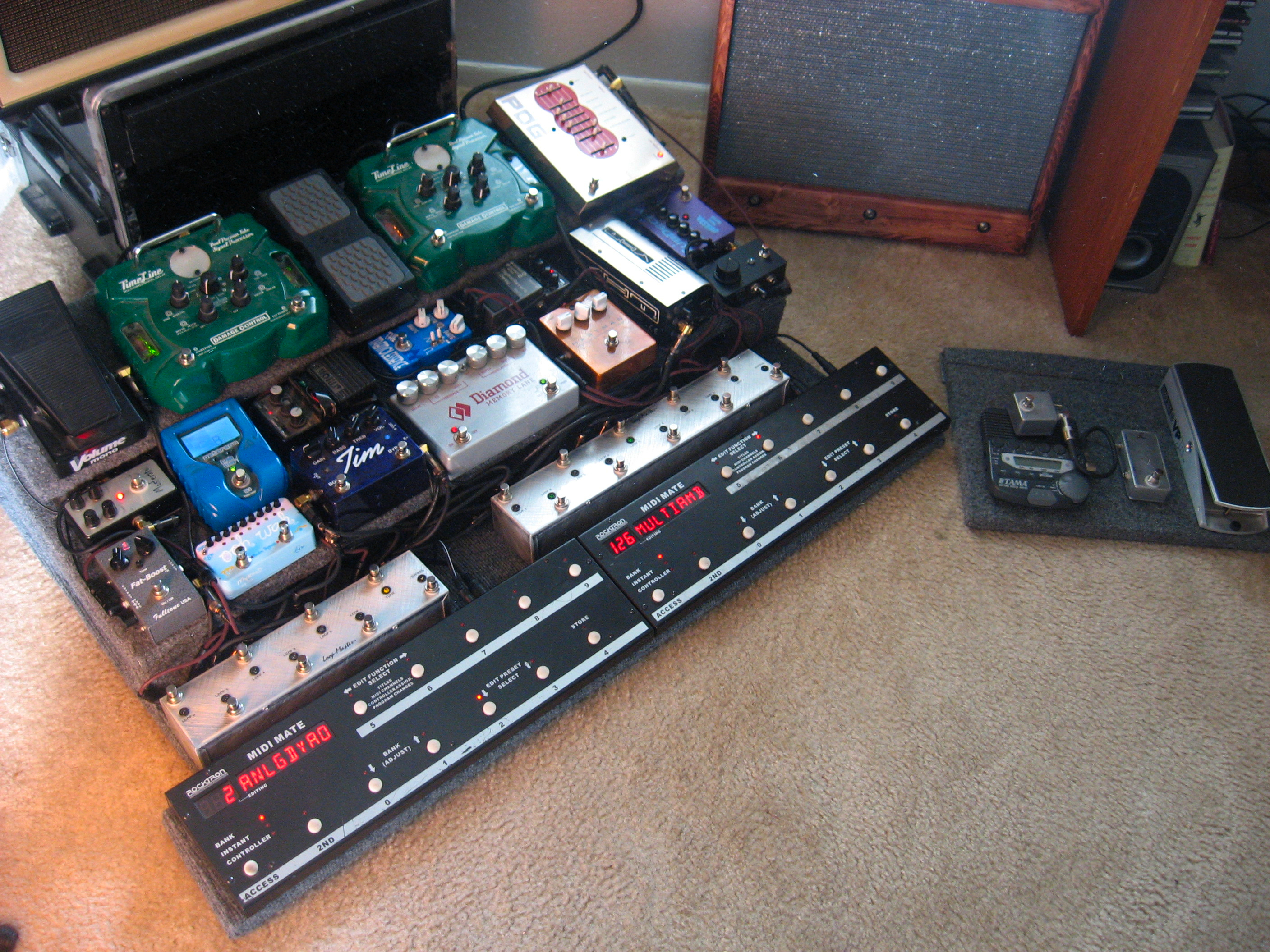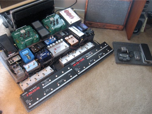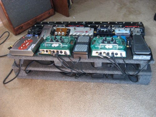 The whole thing, including the amp, is powered by the Furman Power Factor Pro, with a Voodoo Labs PP2+ coming out of the Power Factor to power most of the individual pedals with isolated outputs. Then there’s also a tuner out on the first Loop-Master box that mutes my signal and goes to the Peterson Strobostomp. The loops not mentioned on the Loop-Masters are currently empty. The Hartman has to be taken out of the bypass boxes because it revolted (a lot) when I put the buffer in front of it. And unfortunately, the buffer sounds blasted good. But the bonus round about having the VHT on the board, is that it also powers four pedals in isolation, so I was able to sell my second PP2+. The parallel looper runs the pedals for my ‘shimmer’ sounds, and that large knob on it is to blend the dry signal with the effected signal. The trick is to run the reverb at full mix, and before the POG, so that there’s almost a slow gear effect on the shimmer. And then Strymon came out with the Blue Sky reverb. Blast. ;) But if it sounds good, it’ll definitely free up some space on my board. For more delay. Oh, most definitely. Oh, and in order to plug in the Rocktron Midi Mate’s (one for each Timeline), I had to reverse the positioning of the two Loop-Master’s on the board, because one was smaller than the other. So the chain there is flipped. Caused some major dyslexia issues the first couple times playing out, but I think I’ve got it figured now. And then there’s an M-Audio expression pedal plugged into one of the Midi Mate’s to control certain parameters on the second Timeline. Oh, and the Midi Mate board disconnects for easier transportation of the board. I also sawed off about six inches from one end of that board to make it less awkward that it’s a little longer than the rest of my board now. (It’s still me, and I’m still not very good at building things, hehe).