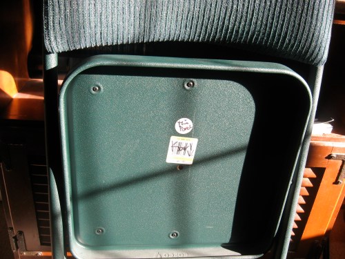 That says ‘Karl V’ and ‘The Porch’. In reference to the worship band that I played two gigs with and was paid enough money to go out to Denny’s (that’s making it) afterwards, named The Porch. Why did I write that on a chair? Oh, because the chair, in cooperation with the car bungee, held up my Crate 2×12. Yes, I considered the chair enough of a part of my rig to write my band name on it. I still remember how proud I was when I wrote that. Folks, if you have a special chair on which you like to set your amp, and you are so proud of that chair that you now believe the aluminum to be made of some little known tone-metal, don’t broadcast it. Don’t write your band name on the chair as if someone is going to steal and use it’s magical tonal properties for their own purposes. Just keep it to yourself.