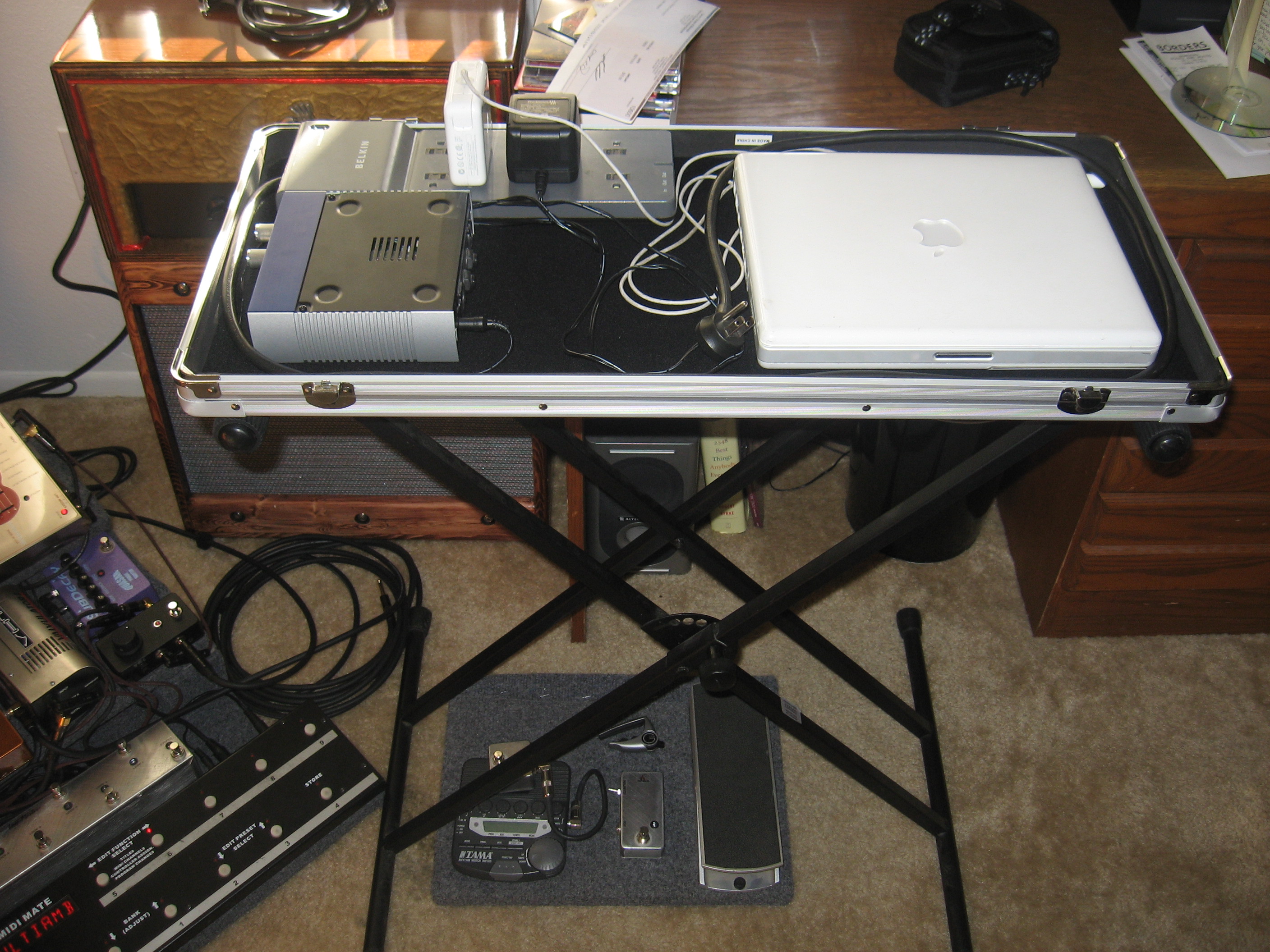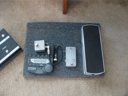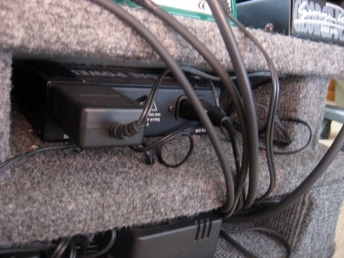The nice thing about having an old G3 Mac? It still runs iTunes and you don’t feel bad about putting velcro on it. :) The other piece there is a cheapo little PreSonus tube preamp that does so little that it actually effects your signal quite naturally and unobtrusively. I use it to run the pads direct (*gasp*) for those rare times when I need to throw in the bargaining chip of removing one amp from my rig in order to get the sound guy to agree to having the other amp on stage. hehehe Shhh. That one’s a secret. And then there’s a re-housed and modded old Bogen Challenger amp into a RaWoods pine cab with Weber 12A150b speaker, out of which I usually run the pads.