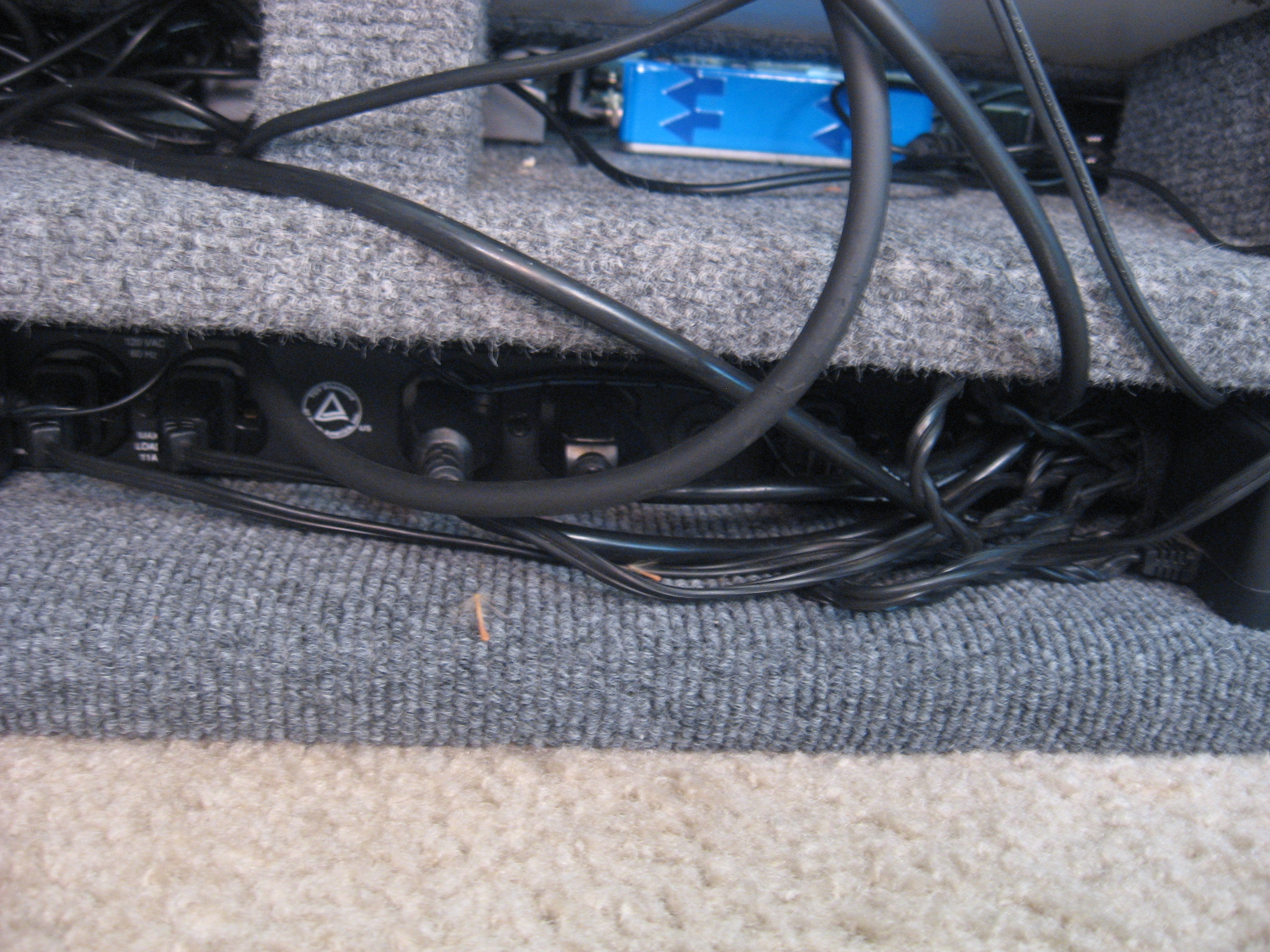 So here’s what I did. In order to save my arms, I sawed off the 12×16″ rectangle on the right side of the board. And then in order to keep the Furman Power Factor Pro power conditioner on the board, I carpeted another board, and put it underneath the current board, about 3″ below. But I also made sure that new board was 36×20″, so as to have an extra 4 inches for the Loop-Master bypass boxes, and hence more room on the original part of the board for pedals. There’s the power conditioner: