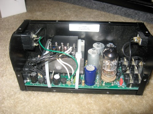 And here’s the inside of mine. Very nicely wired, and a lot going on. Kind of like a mini amp. Oh, and I made sure to take the picture after installing the JJ gold pin ECC83. (There are two things to take note of here, for when you are talking tone with other guitarists. Use the word ‘install’ whenever possible, even if it’s just referring to popping a tube in and out of a socket or plugging a cable in (i.e. I just installed some Lavacables on my board); and always use the British designation of tubes. ECC83 is really just a 12AX7 by the American designation. But ECC83 sounds waaaay better.)