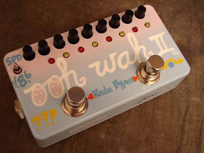 And there ya go. The only other use besides step filter sounds, that I have found for the Ooh Wah. Incredible step filter, and when played consciously, can be used for regular auto wah sounds and, as in this case, for a color under your ambient effects. And for those interested, the signal chain here was my normal Prairiewood into the Matchless HC30, and effects were Ooh Wah–>Dr. Scientist Tremolessence–>Damage Control Timeline (swell settings)–>Diamond Memory Lane–>Damage Control Timeline (low mix infinite reverse settings)–>Arion SAD-1. And a couple quick notes on the Ooh Wah. One, there are two versions. Version 1 starts at random points in the sequence when you turn it on. Version 2 holds at the first step of the sequence in bypass mode. Personally, I prefer version 1. And secondly, it does not have an adapter jack, so it needs to be powered by a battery or a ZVex power plate, which unfortunately costs a good $30 on top of an already kind of expensive one-or-two-trick-pony pedal. But the batteries do last quite a while in this thing, and it is handpainted of course, so that more than makes up for it. So sad that I’m serious right now.